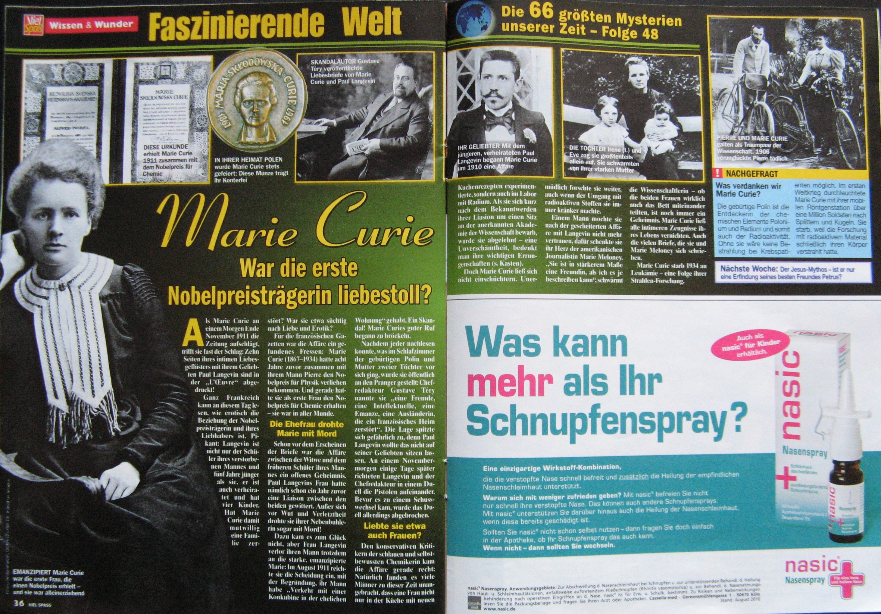 „Marie Curie – War die erste Nobelpreisträgerin liebestoll?“ Denn das ist es doch, was vielleicht nicht uns, aber zumindest die Leser der „Viel Spaß“ an Marie Curie interessiert.