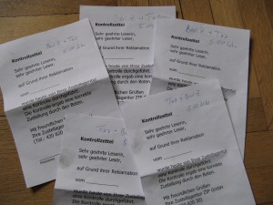 Wie dem auch sei, am vierten Tag hatte die Frau Mitleid und versprach, nicht länger nur Fehlermeldungen am Computer auszufüllen, sondern persönlich bei der zuständigen Zustellagentur nachzuforschen. Mit durchschlagendem Erfolg, denn am nächsten Morgen fand ich nicht nur zwei Zeitungen, sondern auch diesen Zettel im Briefkasten vor: