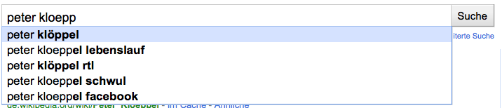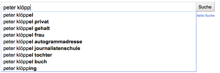 Ich finde, das könnte der Beginn einer wunderbaren Reihe werden. Freuen wir uns also auf Störche zum Geburtenanstieg, Elefanten zu Berichten aus Meißen und Bären für besonders schwere Problemfälle. Und überbrücken die Zeit bis zum nächsten Post mit Wundern über die Suchvorschläge, die Google zum Thema Peter Klöppel zu bieten hat: