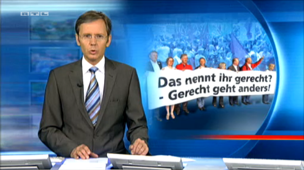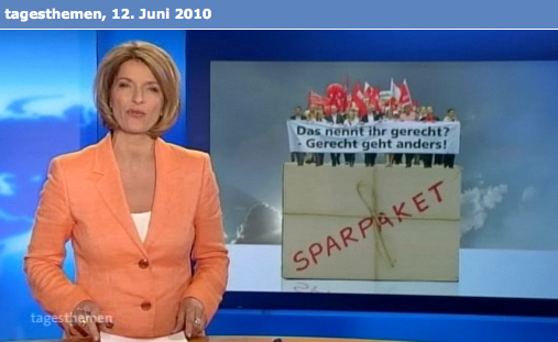 Erst dachte ich, es handelt sich hier um einen Beitrag zu neuen Warnhinweisen auf Zigarettenpackungen. Doch in Wirklichkeit mokiert man sich über Demonstranten, die das schöne Sparpaket unserer Noch-Regierung mit Füßen treten. Undankbares Pack. Sind wohl alles Hartzis, die an einem Samstag überhaupt Zeit für so was haben, weil sie weder Rasen besitzen, den man mähen könnte, noch Zutritts zu Golfclubs erlangen. Und dann führen sie auch noch Fahnen in Kommunismus-Rot mit sich. Schamlos, wie fies sich das mit Apricot beißt. Kein Wunder, dass Frau Holst da so einen Fluntsch zieht, zumal man sie schon zum Pausenclown für die Fußballanalysen des Nelling erklärt hat. Nee, ganz klar, gerecht geht anders! Und die farbliche Abstimmung mit der Bebilderung auch: